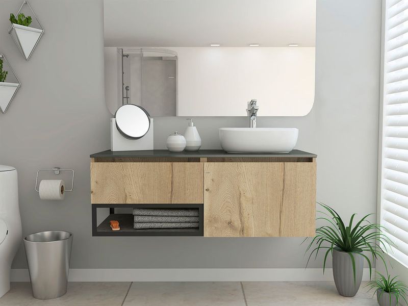Mueble Lavamanos, de 120 cm es ideal para espacios de baño amplios, tiene un cómodo mesón y espacios de almacenamiento con una repisa inferior expuesta de fácil acceso. Encuéntralo en presentación con lavamanos.